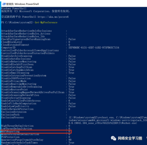 以管理员权限打开PowerShell,输入“Get-MpRreference”查看安全设置。