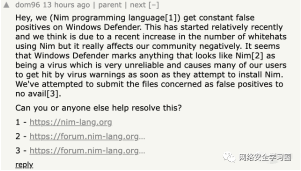 因为使用Nim的黑客太多了,现在Windows Defender直接把Nim的安装程序都误报成了病毒,提交了误报核查目前还没有结果。