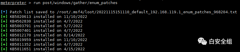 run post/windows/gather/enum_patches查看打了哪些补丁