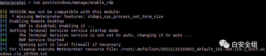 run post/windows/manage/enable_rdp开启远程桌面并创建一个新的用户