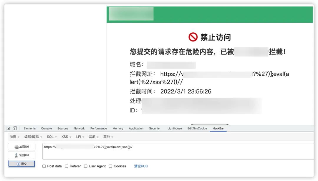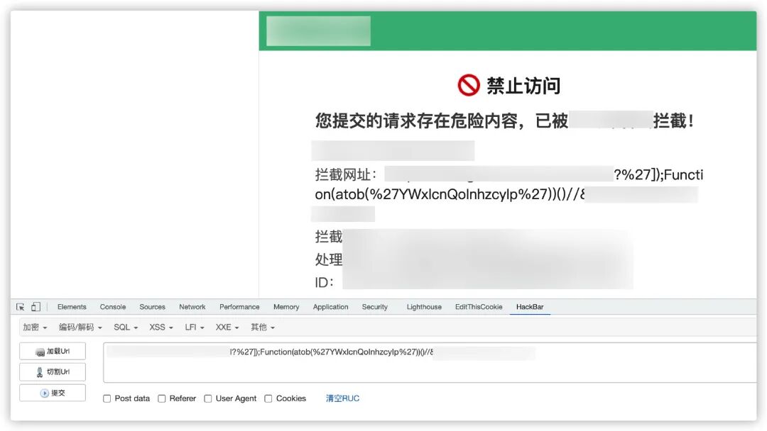 由于eval,alert,括号等太敏感~毫无疑问,直接被WAF秒了