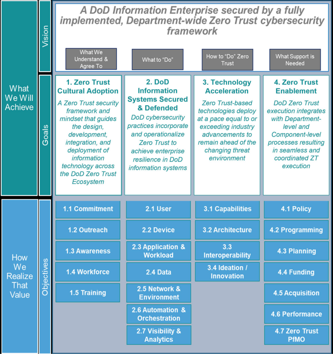 为实现零信任愿景,美国防部概述了四项高级综合战略目标: