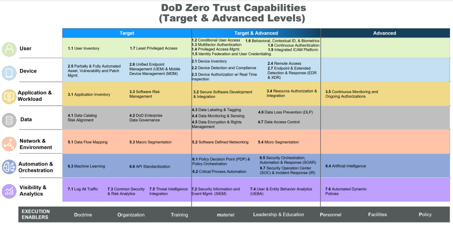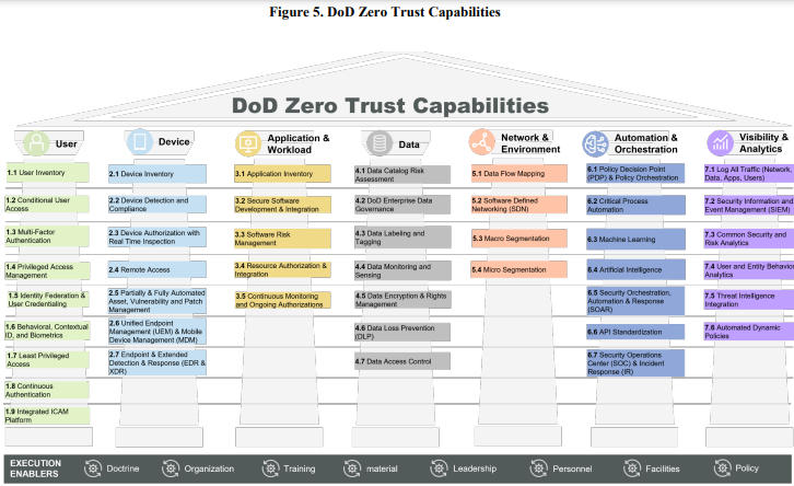 美国防部方法包括围绕七个支柱组织的45项独立“能力”,包括:用户;设备;网络和环境;应用程序和工作负载;数据;洞察和分析;自动化和编排。