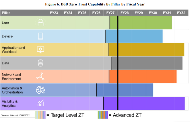 该战略还将美国防部在这些支柱上的预期进展分为“目标”和“高级”零信任级别。
