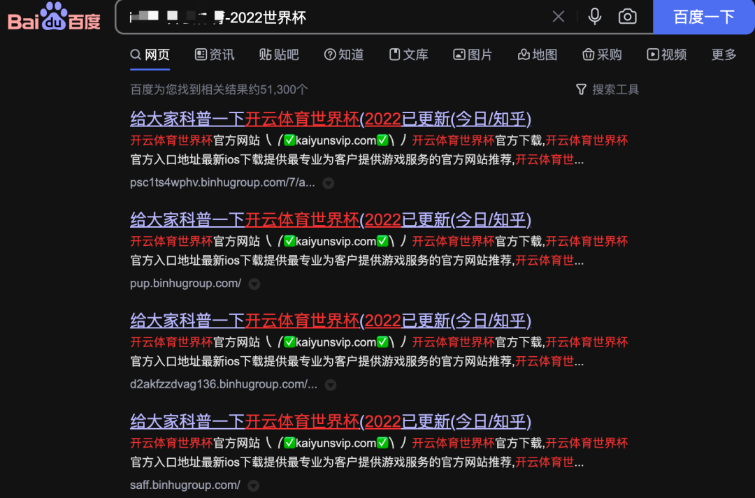 大家常用接触到的博彩都是通过搜索引擎,如下在百度搜索引擎中搜索XX-2022世界杯我们发现的大量世界杯赌博推广网站。![]()