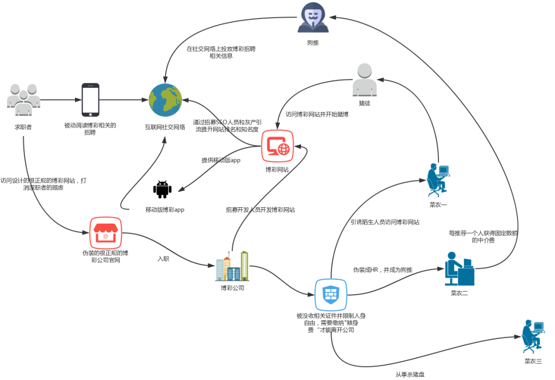 博彩行业无孔不入,已经完全渗透到普通老百姓的日常生活之中。博彩公司为了提升网站排名和知名度需要寻找相关平台进行推广,推广网站通过仿冒权重高的学校政府企业网站来提升在搜索引擎中的排名。我们尝试访问这些网站,发现经过多次重定向才跳转到了真正的博彩网站,这种操作应该是绕过搜索引擎的防毒警告。用户检索的大致流程如下:![]()