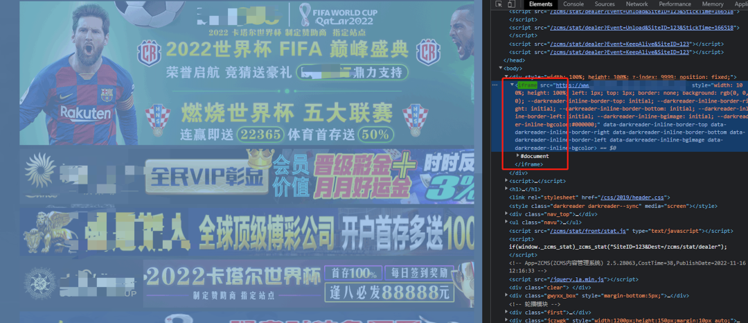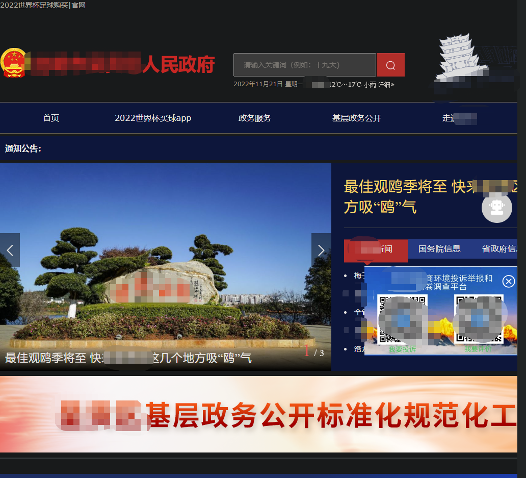 进一步分析发现这些推广网站源码中存在大量正常网站的代码,推广页面是由外部Js引入的Iframe标签嵌入到正常网站之上,通过Css布局遮盖正常站点。我们通过浏览器来隐藏这些Iframe标签,发现原站为某市区的政府网站;从这波操作可以看出“菠菜”网站通过仿冒权重高的政府网站来提升在搜索引擎中的排名。![]()