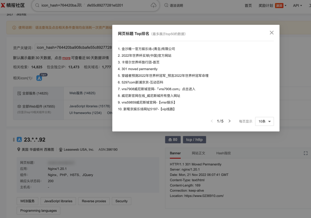 世界杯赌博网站90%都是推广网站,基于以上分析我们可以从以下这几个方面提取推广网站的特征:4.引入Iframe的是第三方网站的Js且通常不会改变,可以用md5作为特征。通过对以上特征,我们可以在微步X社区-资产测绘上检索出同批次的大量站点:![]()