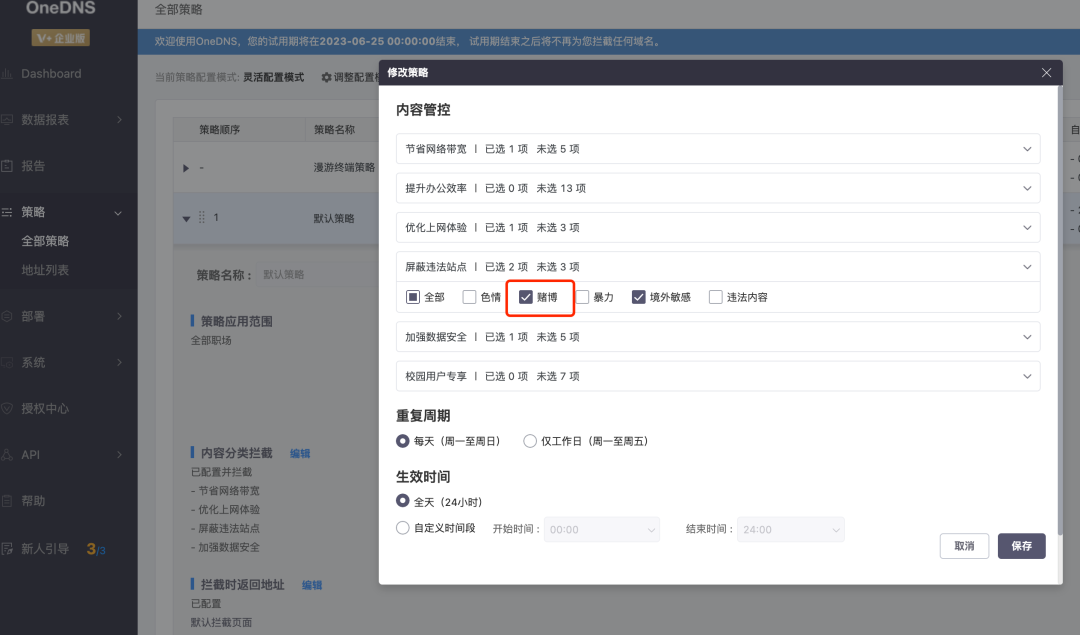 2、微步在线产品OneDNS支持该类站点的实时拦截阻断,只需要在配置界面配置相应的拦截分类即可生效;![]()