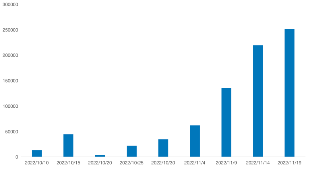 微步在线网络空间测绘系统的统计分析,随着2022卡塔尔世界杯的进行赌博网站的变化呈现较大幅度的增长,而近期处于推广的一个顶峰。如下为近期一个月2022世界杯赌博站点的增长趋势统计图:![]()