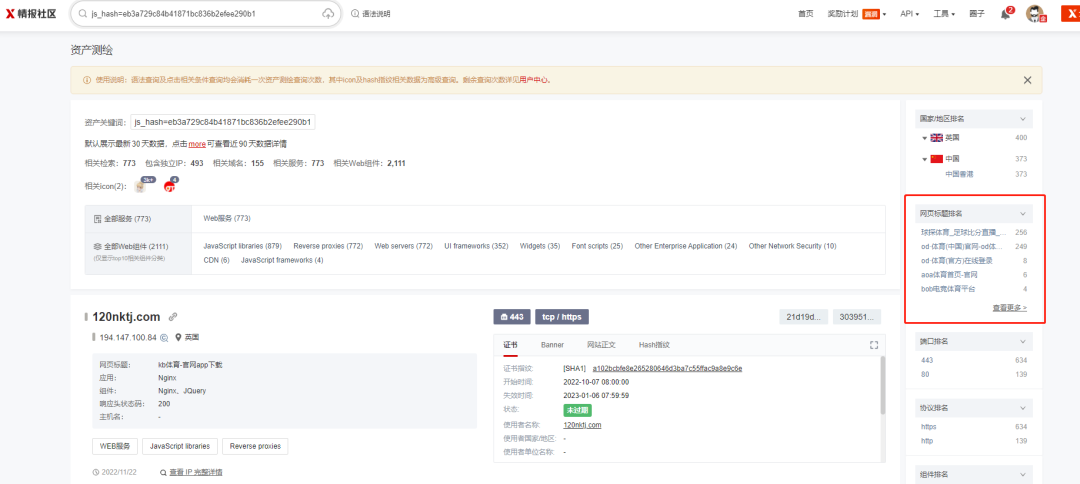 1、X情报社区-资产测绘完全支持和满足该同类型资产的Hunting检索功能,如:基于网页Title信息、特征Hash、Icon图标、SSL证书、网页结构树等快速检索;如下图:![]()