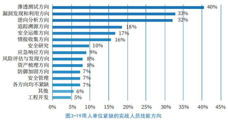 网络安全领域呈现的是结构性紧缺,即高层次人才供给严重不足,基础岗位人才技能水平难以跟上企业发展要求。根据权威机构调研数据,用人单位最紧缺的网络安全攻防实战人员,渗透测试、漏洞发现与利用和逆向分析技能缺口较大,分别占比40%、33%和32%。具备上述技能的人才对用人单位来说炙手可热。![]()