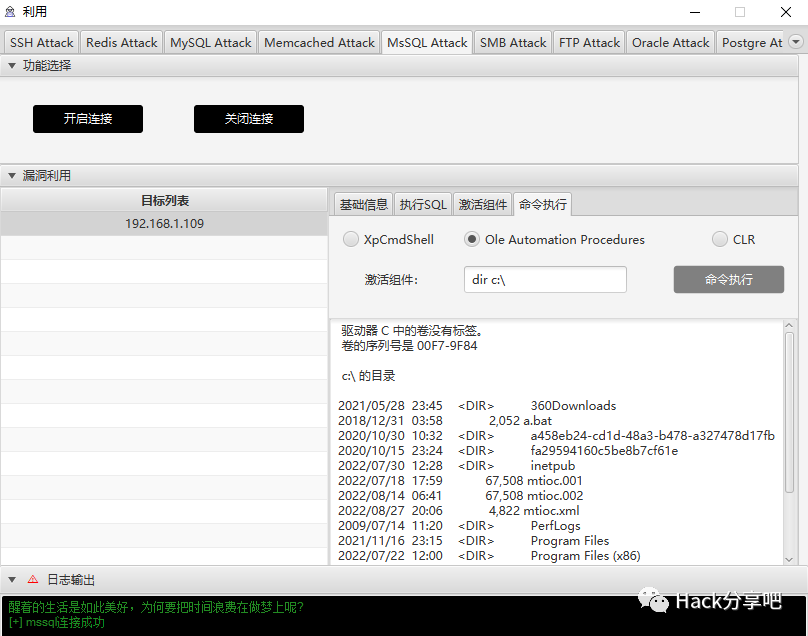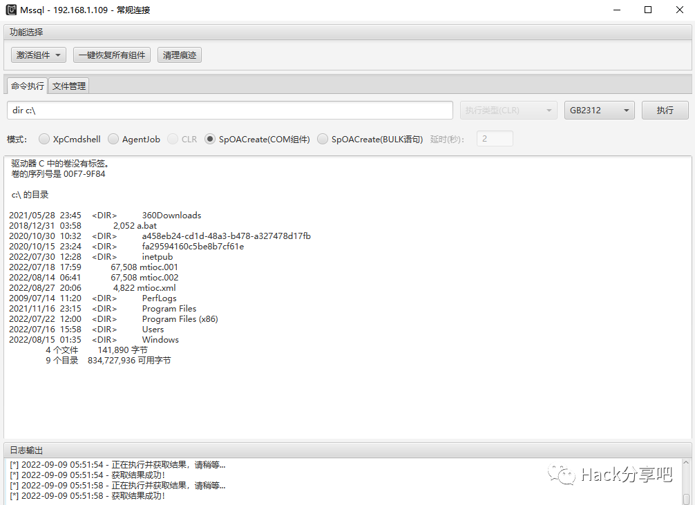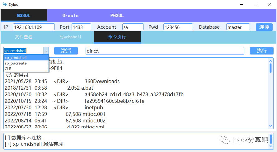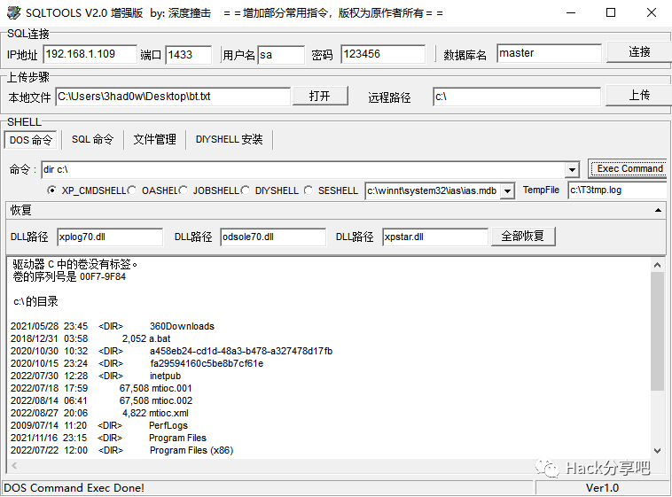 支持功能有:上传文件、执行命令(xp_cmdshell、oashell、Jobshell等)、SQL命令、文件管理、组件恢复等,oashell是通过写入读取文件方式回显。