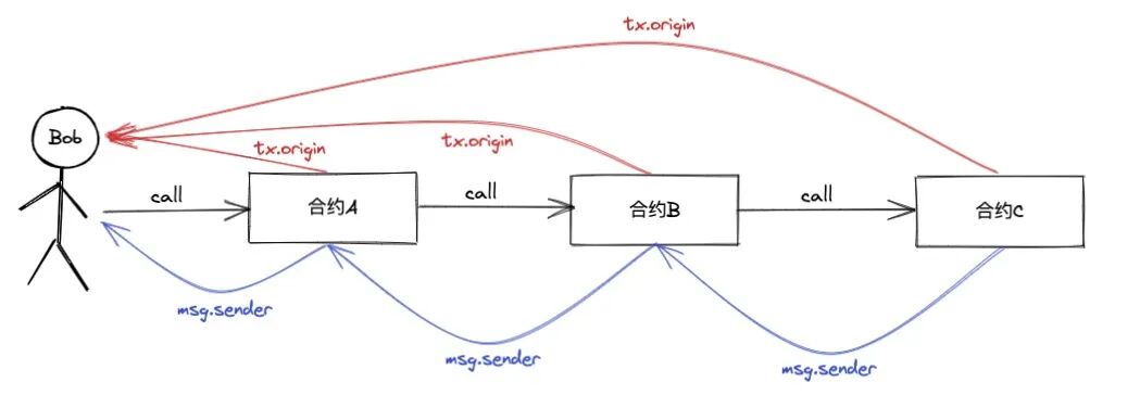 由下图可以看到,Bob 通过 A 合约调用 B 合约,B 合约又调用 C 合约。对于 C 合约来说,tx.origin 为 Bob ,msg.sender 为 B 合约。对于 B 合约来说, tx.origin 也是 Bob , msg.sender 为 A 合约,对于 A 合约来说,tx.origin 与 msg.sender 均为 Bob 。这里我们可以得出一个结论:tx.origin 永远都是 EOA 地址,msg.sender 可以为 EOA 也可以为合约地址。