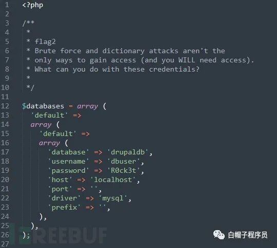 最终是在 /var/www/sites/default/settings.php文件里找到了flag2。这个文件里面还有数据库的配置信息。