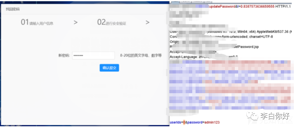 发现请求体里只有userIds和password两个参数,前者是要修改密码用户的uid,后者是新密码的值,猜测这里可能存在任意账户密码重置,而后又意识到我们传入的用户不存在,所以前端存储的userid变量为0,于是我们将请求包中userIds字段修改为1,尝试重置管理员密码。