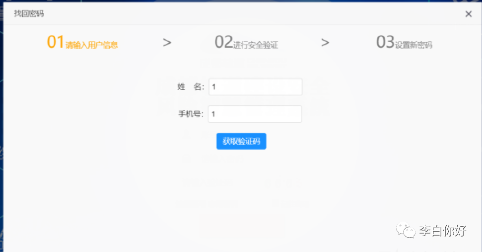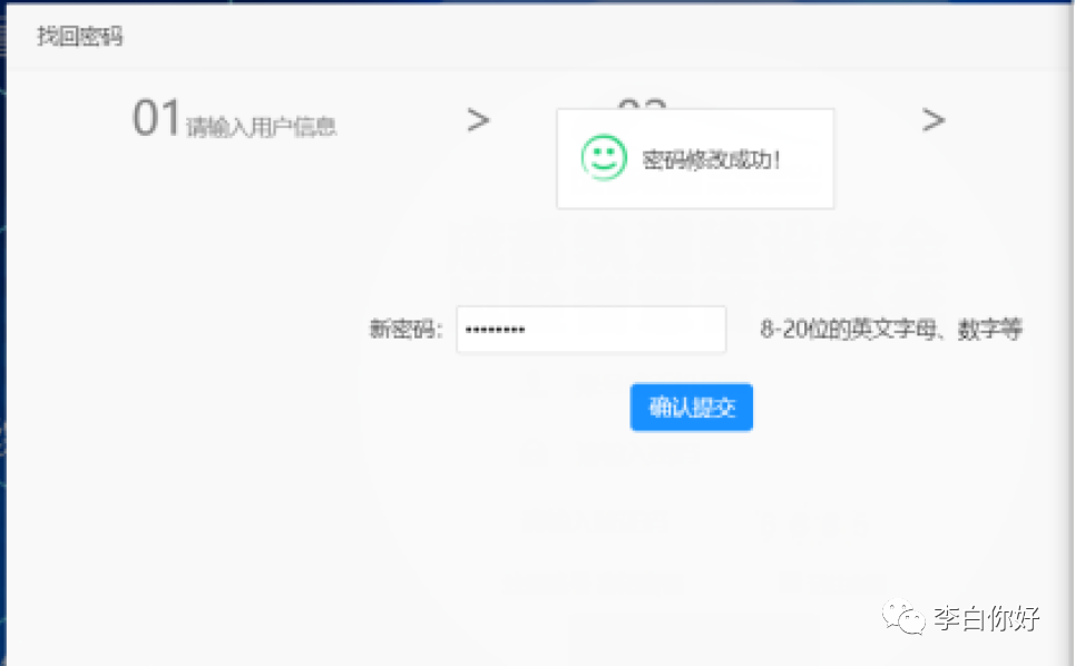 填入验证码,直接跳转到第三步修改新密码,填入新密码后,点击提交