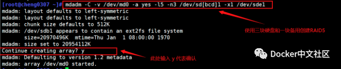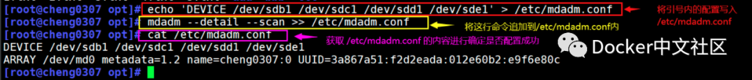 [[email protected] opt]# echo 'DEVICE /dev/sdb1 /dev/sdc1 /dev/sdd1 /dev/sde1' > /etc/mdadm.conf