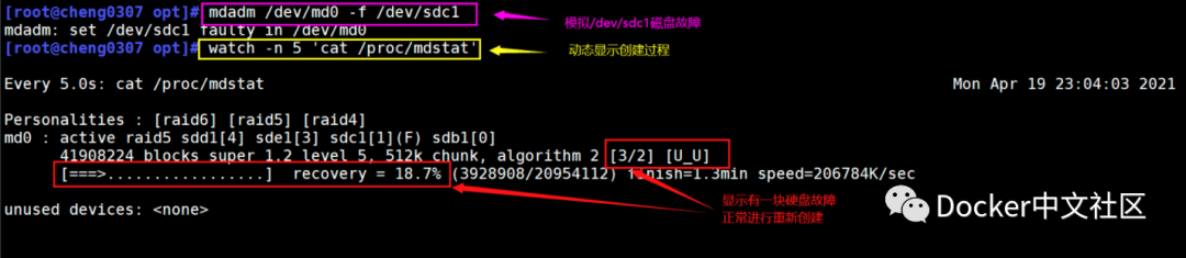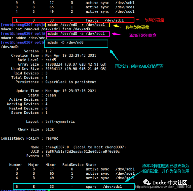 -A:启动RAIDmdadm /dev/md0 -f /dev/sdc1 — 将指定磁盘设为故障