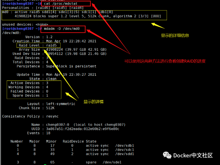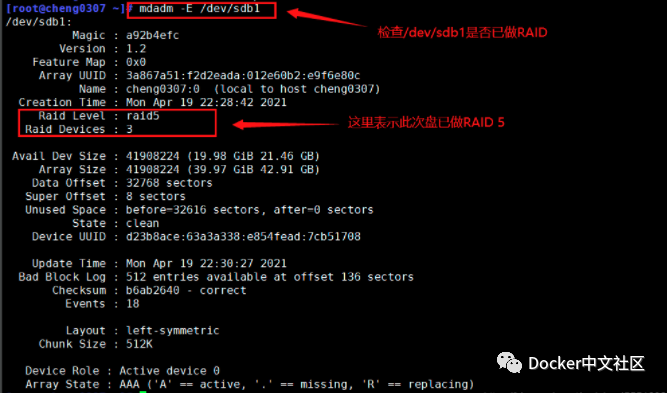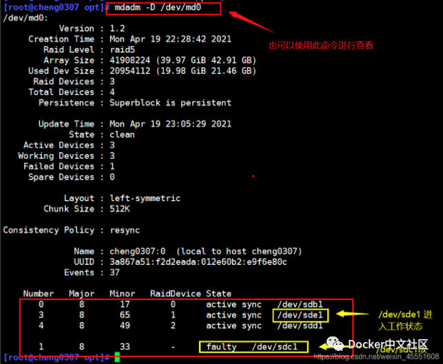 41908224 blocks super 1.2 level 5, 512k chunk, algorithm 2 [3/3] [UUU]#mdo:表示后面创建raid5 包含了sdd1,sde1,sdc1,sdb1
