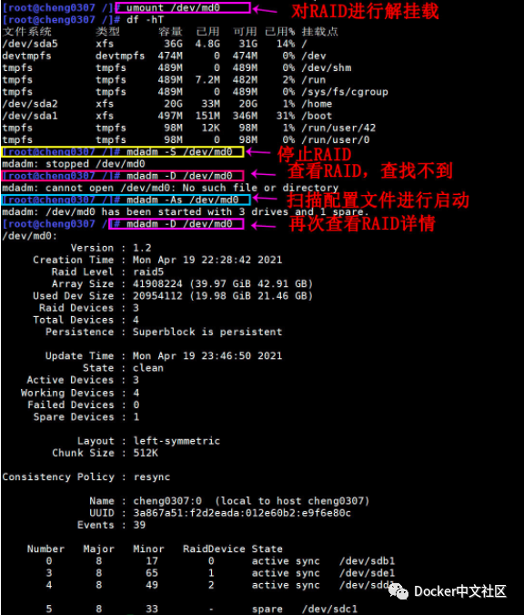 如果没有第七步进行/etc/mdadm,conf配置文件的添加,停止后扫描不到配置文件将无法启动。