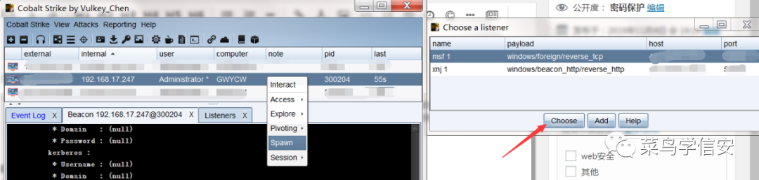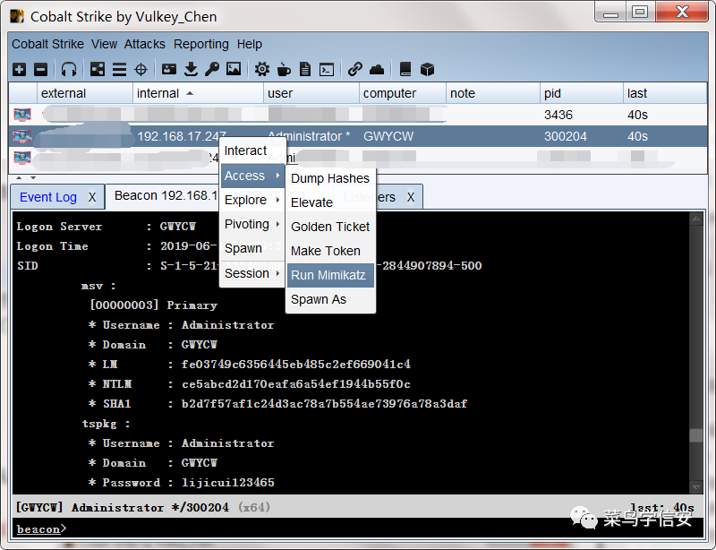 拿到shell后,看了一下是不是在内网环境,然后又看了下是不是在域内,不过很可惜,没有看到域。我先用cs生成个exe,先上线cs先。由于是administrator权限,第一步肯定是先用猕猴桃抓一波密码。