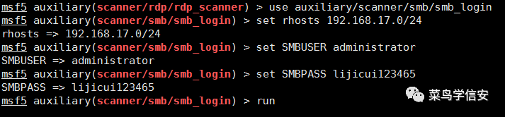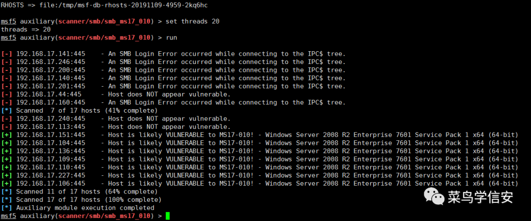 使用smb_ms17_010模块探测MS17-010漏洞。