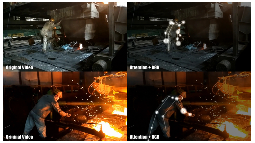 从图4的第一行可以看出,两个操作者合作将钢粉推入中间包。该算法利用大尺度目标部分覆盖另一个目标,但被覆盖目标的关节点重新加权,使其与大尺度目标的关节点接近。在另一排,一名操作人员正双手拿着工具,对钢水进行穿孔,以手动测量液位。我们注意到他的被遮挡的左臂被重新加权以形成动作组件的鲁棒表示。