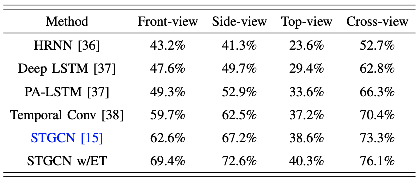从表1可看出原始STGCN在四个视图上的精度全面领先于其他方法。与最初的STGCN不同,我们框架的扩展模板通过考虑更多的空间布局来重新加权微小动作组件之间的关系,而不是投票决定整个动作的特定语义的最终结果。