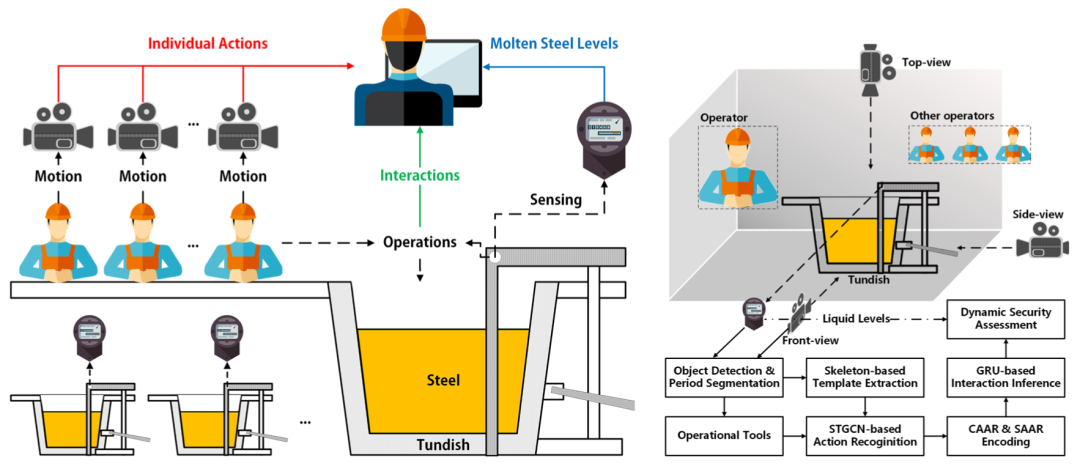 本文提出了一种新的安全评估框架,与传统的基于传感技术的静态监控系统不同,该框架能够通过视觉感知自动检测目标。我们使用基于骨架的图卷积网络(GCN)来生成动作词汇表,以作为动作到动作共现关系的中间表示,这些表示被编码到顺序交互模型中以形成交互表示。以钢水液位状态作为参考标签,将其序列输入到具有多层门控递归单元(GRUs)的递归神经网络(RNN)模型中,捕捉导致事故的关键交互作用,并利用注意力机制对行为进行重新加权,剔除无效交互作用,场景的预测标签和隐藏状态在多层GRU之间传递。最后,通过计算一个带有正则化交叉熵损失的联合目标函数,优化全局输出,实现对安全性的动态评估。在自主收集的合作伙伴I & S公司数据集和在线视频片段上,该框架的性能优于现有的安全评估方案。