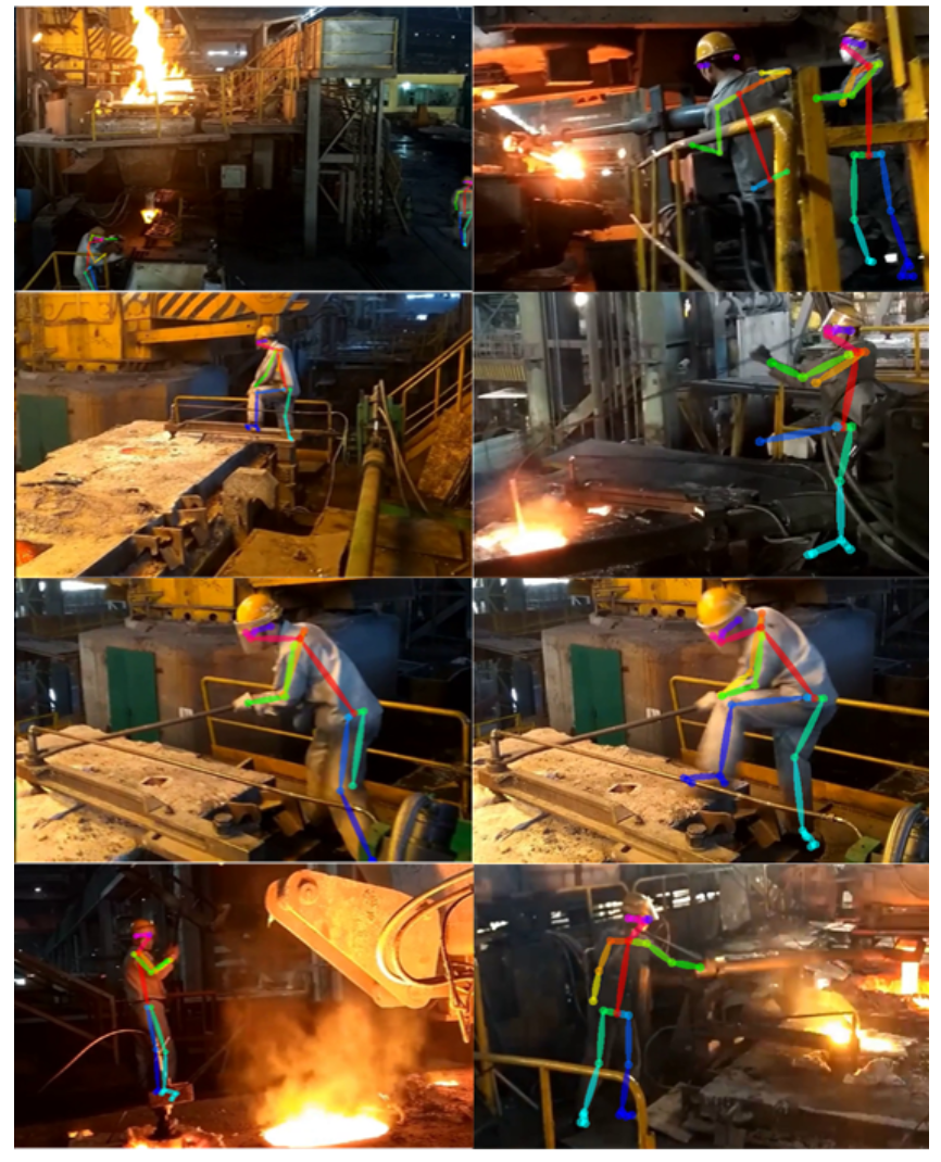 在所提出的框架之前,可以基于深度架构快速检测对象,可以基于深度架构快速检测对象,并且通过回归一系列边界框B来覆盖对象。对于第i个操作者,在固定大小的采样窗口T期间,其运动轨迹被记录在框 的时间序列中。考虑到人体运动的复杂性,我们使用基于骨架的模型对个体动作进行分类,并为它们分配一组标签A。具体而言,利用OpenPose工具箱估计人体模板的关节点,并设定空间配置划分策略,将整个节点集划分为若干个子集。每个子集覆盖一组成员节点及其唯一的根节点。根据有限的人工操作,定义了5种特定的操作,其中包括“锤击”、“钩挂”、“推”、“拉”和“穿”。同时给予了漏钢、低、正常、高、溢出等五种钢水液位状态。