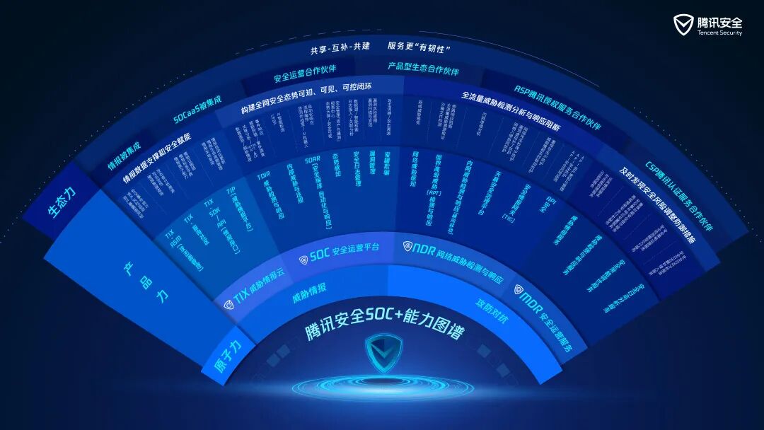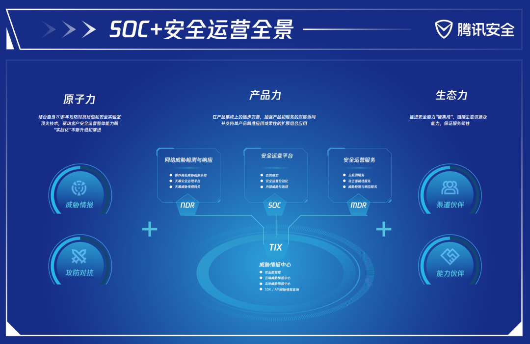 腾讯安全基于20多年攻防实战经验,业内顶尖安全实验室的安全能力、算法算力平台的安全大数据和AI技术,率先推出腾讯“SOC+安全运营体系”,通过原子力、产品力和生态力打造全新的安全运营体系与架构。腾讯SOC+集成了TIX威胁情报中心、SOC安全运营平台、NDR网络威胁检测与响应、MDR安全运营服务四大产品矩阵,助力政企机构全面提升安全防护能力和安全运营效率。