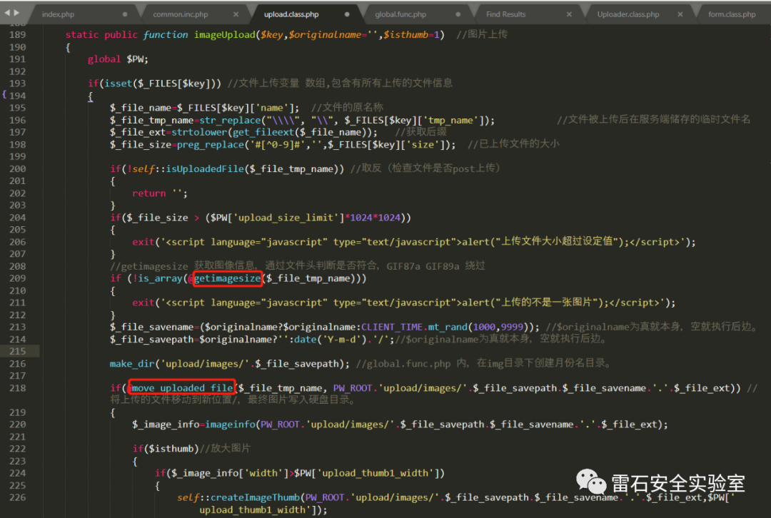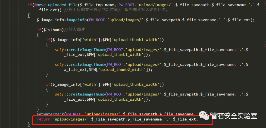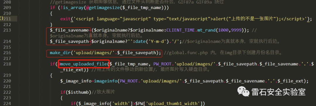 到了218行,if内表达式 使用move_uploaded_file将文件从tmp临时目录移动到网站上传目录内,此时文件已经写入硬盘目录。move_uploaded_file执行成功后会返回 真值,进入if内进行图片文件尺寸放大等操作。