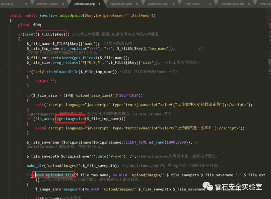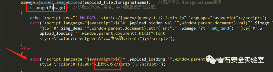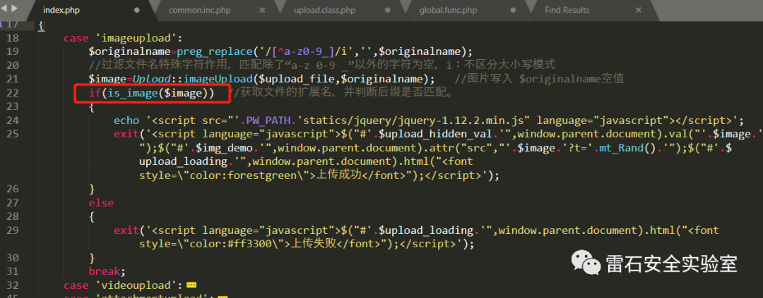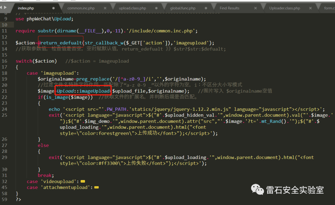 switch($action){case 'imageupload':$originalname=preg_replace('/[^a-z0-9_]/i','',$originalname);//过滤文件名特殊字符作用,i:不区分大小写模式$image=Upload::imageUpload($upload_file,$originalname);//图片落地if(is_image($image)) { 省略} //is_image() 获取文件后缀