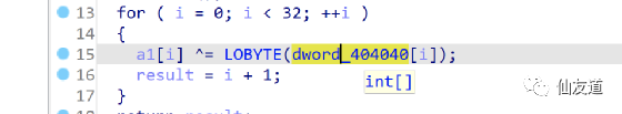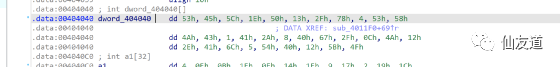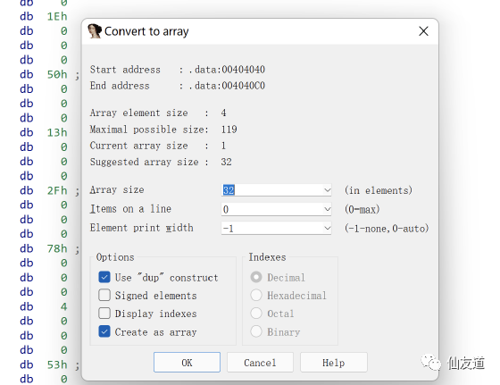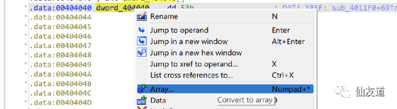 第一个元素地址处,右键,Array => Array element size 表示一个元素的大小,ArraySize 表示数组大小,根据上下文分析,dword_404040的元素大小为4字节,