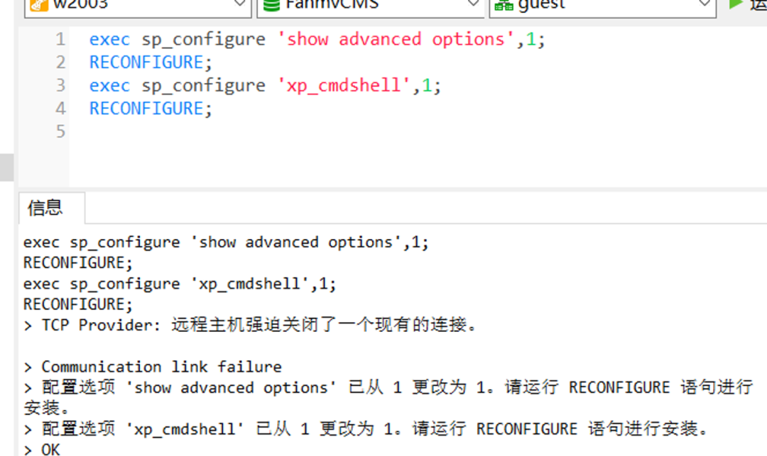 exec sp_configure 'xp_cmdshell',1;