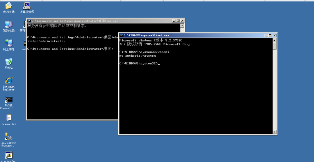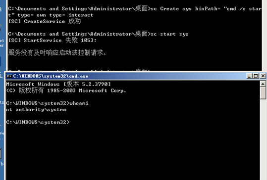 虽然提示失败1053 但是最高权限system窗口弹出来了