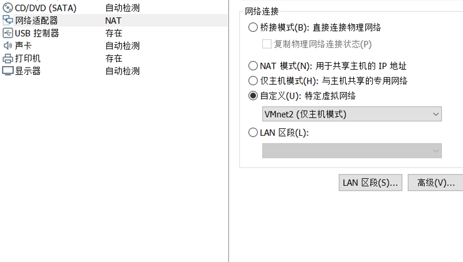 把第一个网络适配器添加上VMnet2这个网络