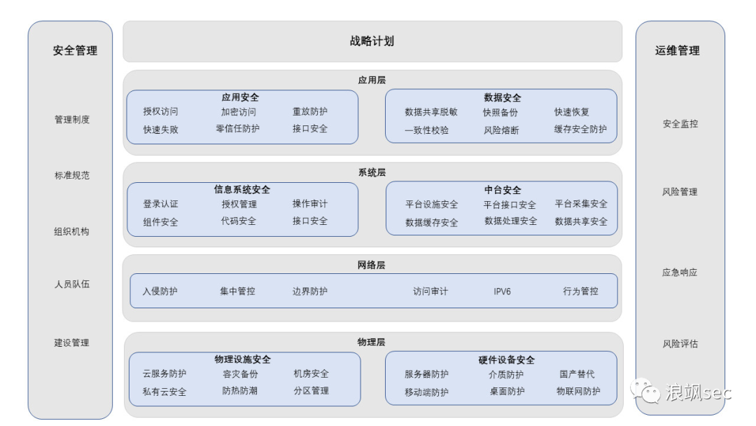 网络安全架构从战略计划、安全管理、运维管理三个维度展开,需要人、制度、机器三方面协作,共同维护网络安全事业。