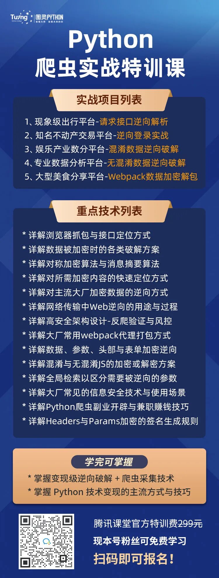 这是一套专讲爬虫与反爬虫攻防的实战课程,迄今为止已经帮助了超3W学员快速进阶!本次课程将由国际大数据竞赛获奖大佬亲身指导,带领大家进行一线前沿技术体系+多重逆向解析项目实战的综合技术速成训练!