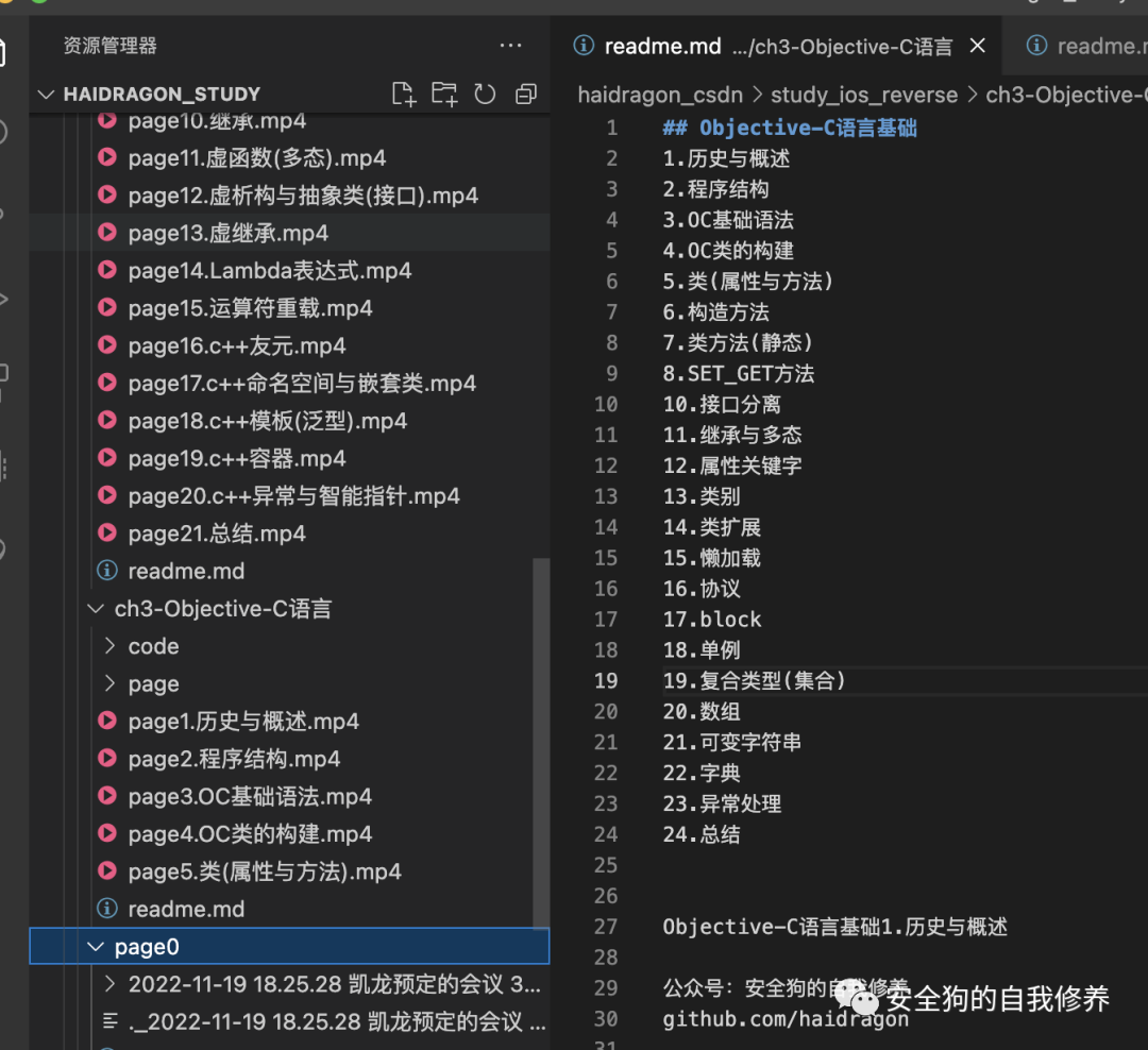 # ios逆向视频教程第一期## 第0章* 0.课程了解与职业规划## c语言基础* 1.历史概述与环境搭建* 2.进制与转换* 3.位与符号* 4.程序结构* 5.语言变量* 6.数据类型* 7.数学运算符* 8.条件语句* 9.循环语句* 10.数组* 11.函数* 12.指针* 13.字符串* 14.作用域* 15.其它数据类型* 16.枚举与typedef* 17.输入输出与文件处理* 18.总结*## c++语言基础* 1.c语言回顾* 2.c++结构体* 3.面对象与类基础* 4.c++类(属性与方法)* 5.静态数据成员* 6.构造函数* 7.其它构造函数与时机* 8.this指针* 9.指针与引用* 10.继承* 11.虚函数(多态)* 12.抽象类(接口)* 13.虚继承* 14.Lambda表达式* 15.运算符重载* 16.c++友元* 17.c++命名空间与嵌套类* 18.c++模板(泛型)* 19.c++容器* 20.c++异常与智能指针* 21.总结## Objective-C语言基础* 1.历史与概述* 2.程序结构* 3.OC基础语法* 4.OC类的构建* 5.类(属性与方法)* 6.构造方法* 7.类方法(静态)* 8.SET_GET方法* 10.接口分离* 11.继承与多态* 12.属性关键字* 13.类别* 14.类扩展* 15.懒加载* 16.协议* 17.block* 18.单例* 19.复合类型(集合)* 20.数组* 21.可变字符串* 22.字典* 23.异常处理* 24.总结