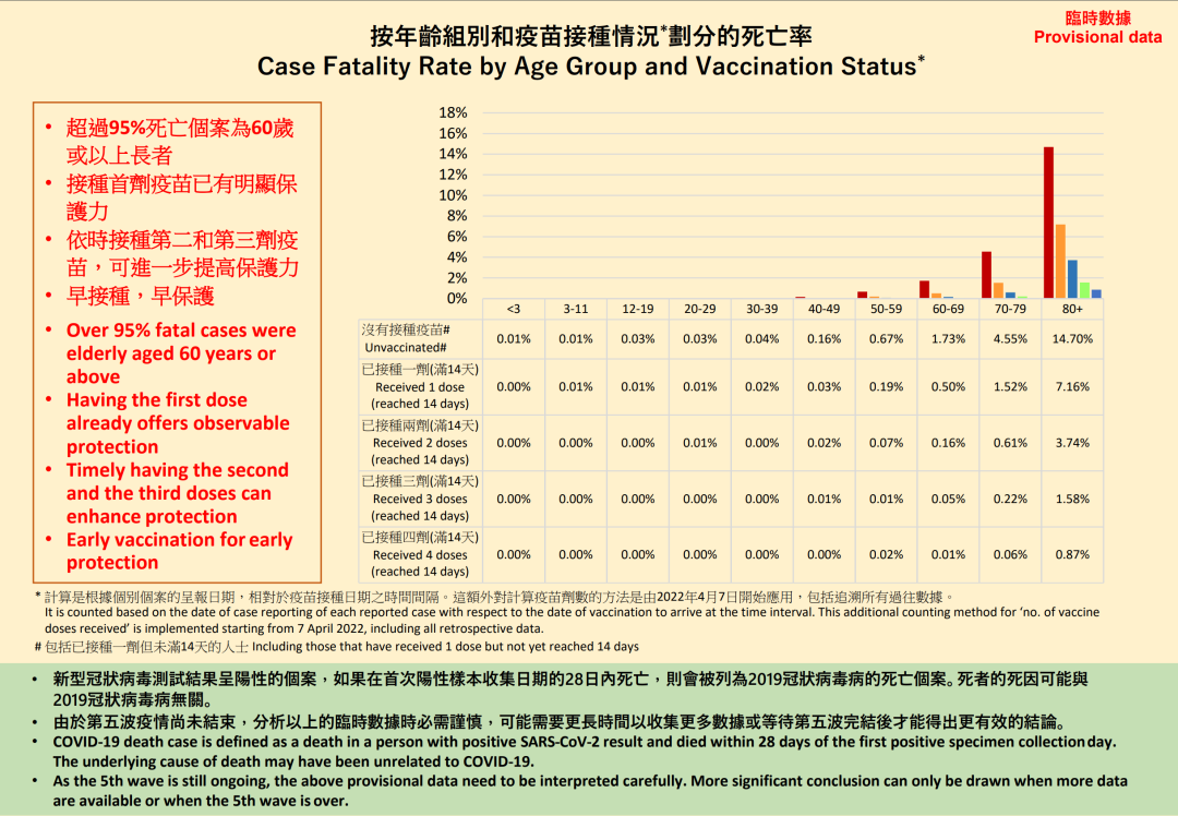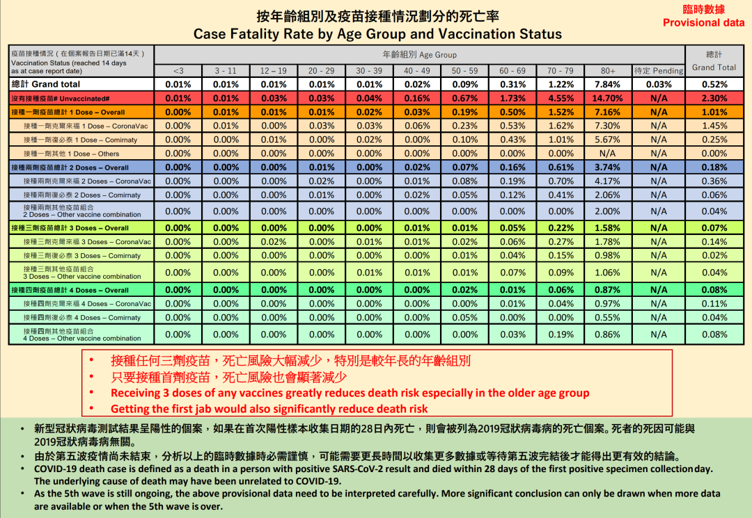 根据香港卫生署卫生防护中心对这一波奥密克戎疫情(2021 年 12 月 31 日至 2022 年 11 月 23 日)的统计:不管什么疫苗,只要接种了,都会大大降低死亡率。即便是 80 岁以上的老人,每一剂疫苗,都会把死亡率降低一半。四剂疫苗可以把 80 岁老人的死亡率降到 0.87%。而对于中青年来说,三剂疫苗就可以把死亡率降低到接近零。