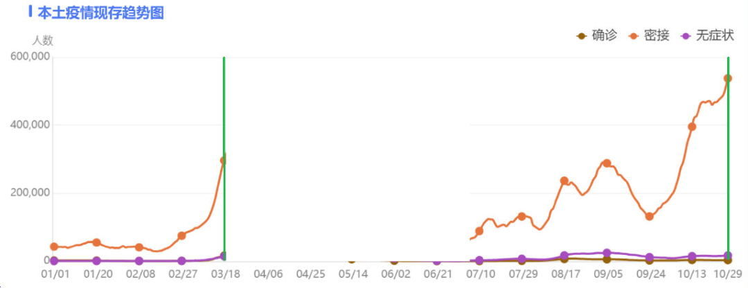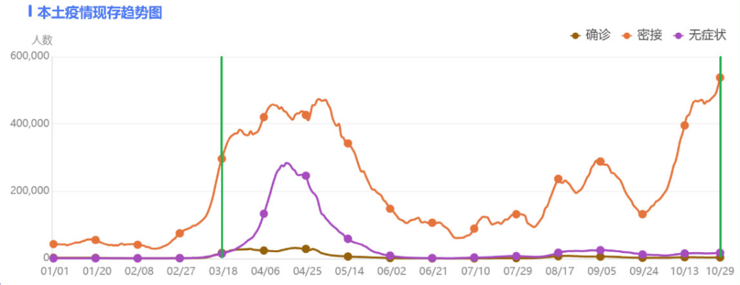 2022 年 10 月 29 日,我把下面这张图发给了一些朋友,并提醒他们要做些准备应对新一轮疫情冲击。这张图其实就是新浪网站的疫情统计图。我只是在上面加了两条绿色的辅助线。