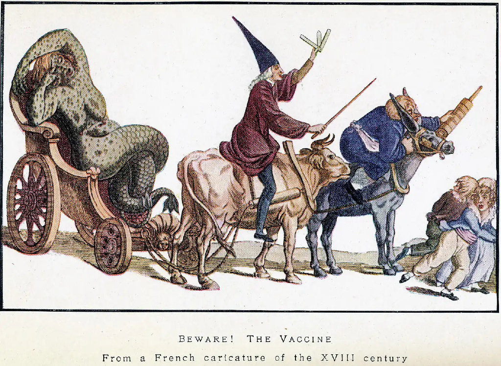 其实,1796 年爱德华·詹纳发明天花疫苗的时候,就有人认为是骗局了。各种各样反对疫苗的声音和疫苗本身一样古老。下面这张就是当时法国的反疫苗宣传画。