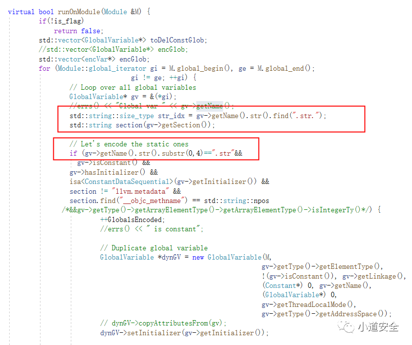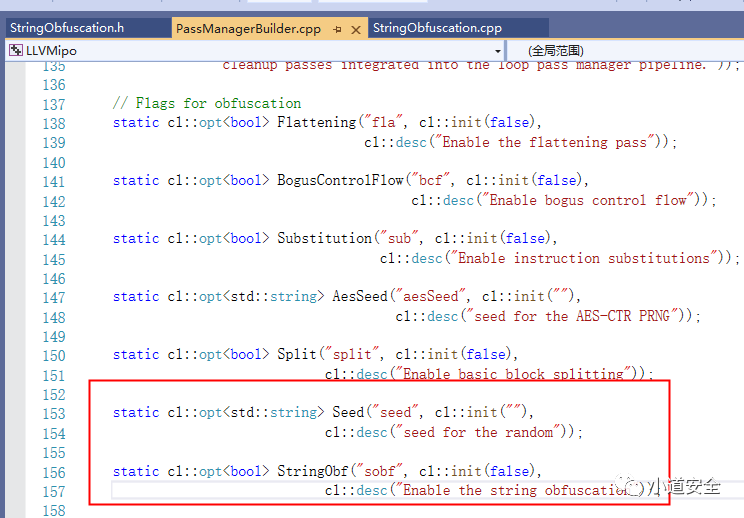 下面的声明的静态全局变量,主要是为了实现编译时候识别 -mllvm -sobf指令的标识,全局开关通过参数来判断是否要开启字符串加密。