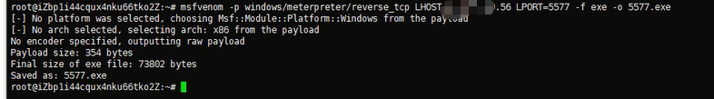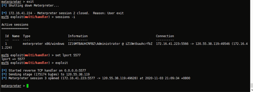6.利用MSF或特定EXP进行提权(msf要搭建在外网,才能将会话反弹到本机,内网不能反弹)生成一个5577.exe后门,webshell执行该后门,反弹的端口号为5577
