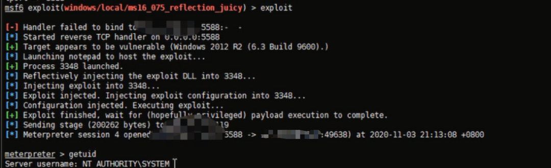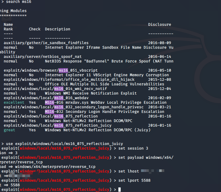 9.利用wesng中收集到的漏洞编号,进行模块利用,并且设置反弹端口,此时的端口号应该与前面的不同,这个端口反弹的权限为提权后的权限,并且监听的回话为3,与上面的会话对应