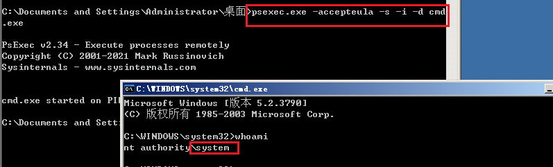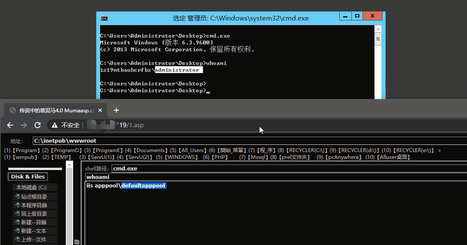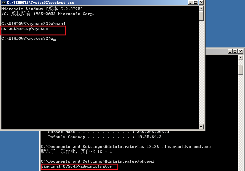 2.在web权限提升中,最常用的是溢出漏洞提权,用cmd去执行文件进行提权,从下图可以清晰的看到我们在webshell看到的权限和服务器上看到的权限是不一样的。